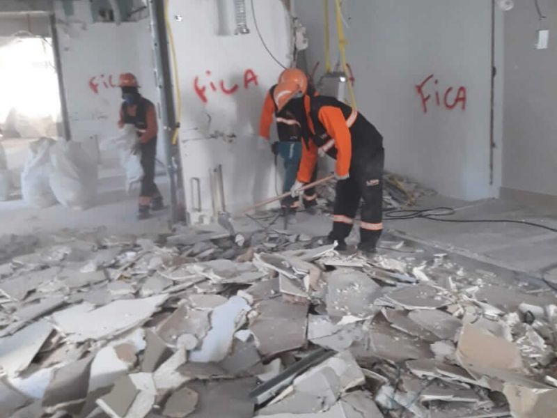 Demolição Retrofit; Demolição interna de divisórias de drywall, paredes de alvenarias, pisos, desmontagens de mezaninos metálicos em 07 (sete) pavimentos do prédio para instalação de empresa Network com remoção e transporte dos entulhos para aterros legalizados, de acordo com a classificação dos resíduos, deixando as áreas totalmente limpas e desimpedidas.