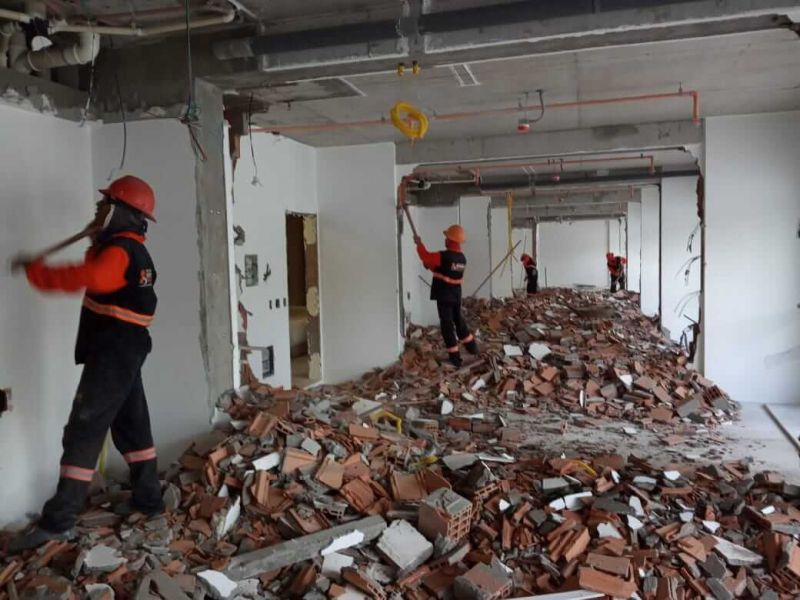 Demolição Retrofit; Demolição interna de paredes e forros com remoção e transporte dos entulhos para aterros legalizados, de acordo com a classificação dos resíduos, deixando as áreas totalmente limpas e desimpedidas.