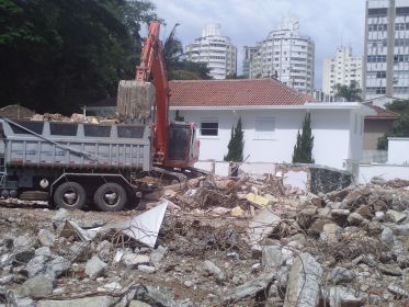 Demolição total de duas edificações comerciais, remoção e transporte dos entulhos para aterro legalizado, deixando o terreno limpo e desimpedido para o novo empreendimento.